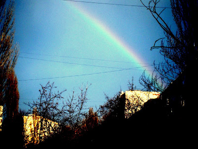 Sunrise out our kitchen window. The big stack is where our hot water comes from.